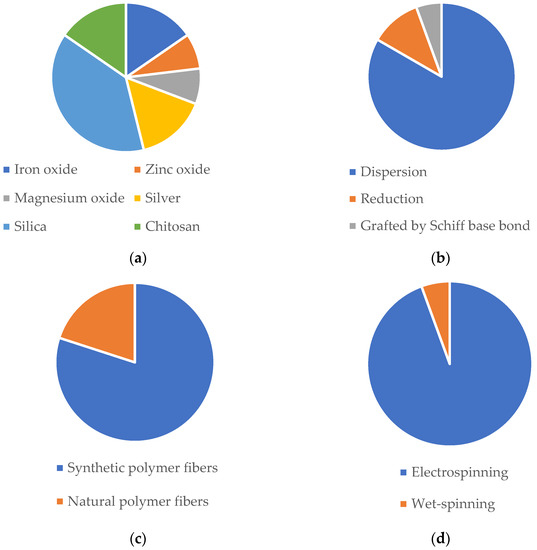 Representative frequency analysis of (a) NP composition; (b) NP loading on fibers; (c) fibers class materials; (d) fiber production method for microbial balance applications according to published literature since 2017 (databases: Scopus and PubMed).