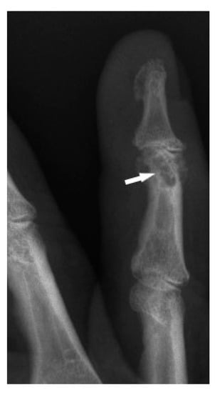 The radiographic appearance of phalanges occupied by sarcoidosis includes lytic lesions of various sizes, called cysts. Cystic lesions, mostly punched-out, may be accompanied by soft tissue nodules. The presence of large cysts increase the risk of pathological bone fracture [20] (Figure 6a,b). Numerous small cysts are more frequently observed. The articular surfaces are preserved, although cysts located in the subchondral layer might mimic erosions (Figure 7). Periosteitis is uncommon.