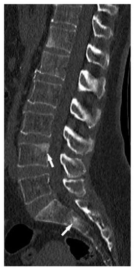 Lumbar spine CT, bone window. Osteosclerotic lesions (white arrows) in the L3 and S2 vertebral bodies.