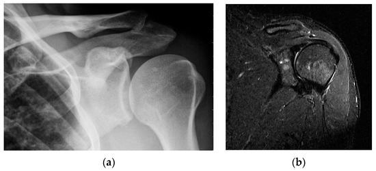 Radiograph (a) and magnetic resonance of the shoulder joint. T1-weighted image with fat saturation and with contrast administration (b). 40-year-old patient with sarcoidosis. Two contrast-enhanced lesions in the acetabulum of the joint ((b), asterisk) not visible on X-ray (a).