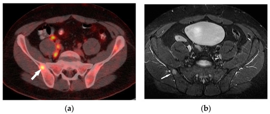 FDG-PET/CT (a) and T1–weighted MRI image with contrast enhancement (b) presents an enhanced lesion with increased FDG uptake (white arrows) in the right iliac bone.