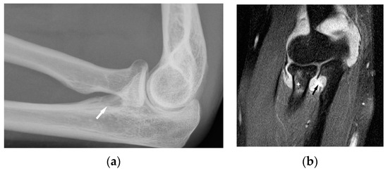 Radiograph (a) and MRI of the elbow (b) performed in a 45-year-old woman with sarcoidosis. Osteolytic lesion in the proximal part of the elbow bone ((a), white arrow). T2-weighted image with fat saturation revealed a synovitis, erosion in the proximal part of the elbow bone corresponding to this bone lesion (black arrow) and slight bone marrow edema in the head and neck of the radius (asterisk).