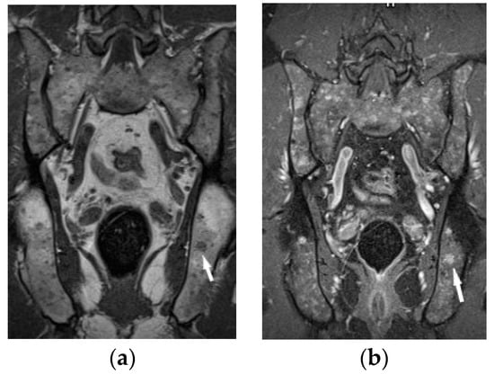 MRI of the pelvis. T1-weighted image, coronal plane (a), T1-weighed image with fat saturation and with contrast administration (b) shows multiple hypointense bone marrow lesions (a) with contrast enhancement ((b), white arrows).
