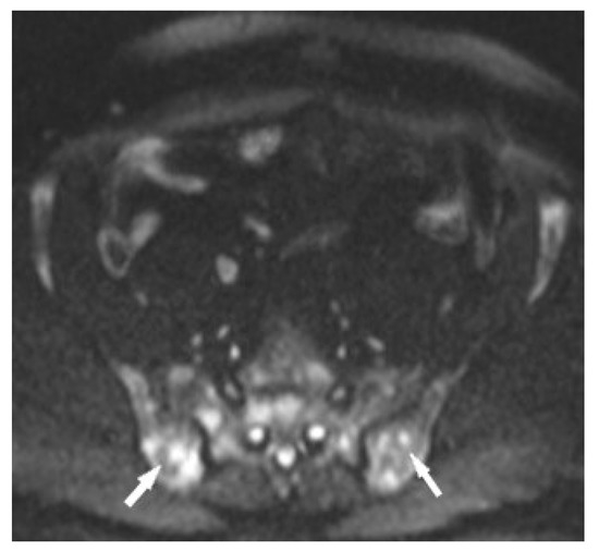 MRI of the pelvis, Diffusion-Weighted Imaging (DWI). Multiple bone marrow lesions with restricted diffusion (white arrows).