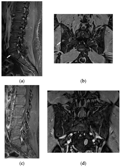 34-year-old patient. T1-weighted images, contrast enhanced, with fat saturation of the lumbar spine and pelvis. Multiple enhanced bone marrow lesions in the vertebral bodies ((a), white arrow) and in the pelvis at the level of the sacroiliac joints ((b), white arrow). Complete regression of the lesions after the treatment in the vertebral bodies (c) and pelvis (d).
