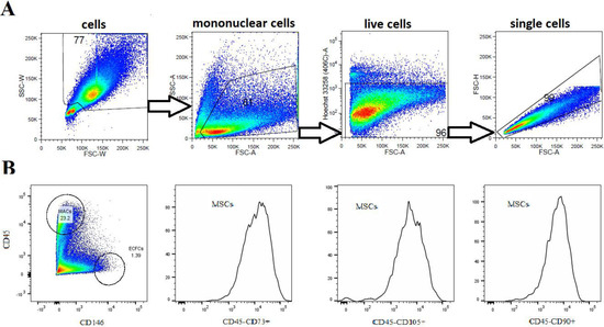 BM-SCs (3rd–4th passage) were characterized using flow cytometry. Analyses of the expression of cell surface markers were performed on a population of live single cells. Cells characterized as CD45−CD90+CD73+ and CD105+ were considered MSCs; CD45+ and CD146- were determined as MACs; and CD45− and CD146+ were defined as ECFCs. Figure 1A illustrates a gating strategy of adherent and nonadherent BM-SCs. MACs represented approximately 23% of CD45+ cells, ECFCs represented 1.3% of CD45− cells, and MSCs accounted for more than 90% of CD45− BM-SCs (Figure 1B).