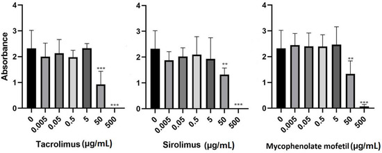 BM-SCs in a final concentration of 25 × 103 cells/mL were cultured in a volume of 200 µL of complete DMEM in 96-well tissue culture plates (Nunc, Roskilde, Denmark) for 48 h untreated or in the presence of tacrolimus, sirolimus, and mycophenolate mofetil (purchased from Sigma-Aldrich) in a concentration ranging from 0.005–500 µg/mL. The metabolic activity of the BM-SCs was determined using a WST-1 assay (Roche, Mannheim, Germany) and a Tecan Sunrise spectrophotometer (Life Science, Mannedorf, Switzerland), and analyzed by Kim 32 software (Schoeller Instruments, Prague, Czech Republic). The WST-1 solution (10 µL/100 µL of the sample) was added to samples for the final 3 h of the 48 h incubation period. The WST-1 is tetrazolium salt, which is cleaved to formazan through a cell mechanism, localized on a cell surface dependent on the production of NAD(P)H. Therefore, the formation of formazan correlates with the number of metabolically active cells.