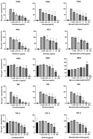 The cells were cultured in 3 different ways: (1) unstimulated, (2) stimulated with IFN-γ and TNF-, or (3) stimulated with cytokines in the presence of sirolimus, tacrolimus, or mycophenolate mofetil in concentrations of 0.005–500 µg/mL. After 48 h of cultivation, BM-SCs were harvested and then placed into TRI reagent, and the expression of genes for COX2, IDO, PD-L1, TGF-β, and iNOS was determined by RT-PCR. IS drugs altered the expression of genes of immunoregulatory molecules. Tacrolimus inhibited the expression of genes for COX2, IDO, PD-L1, TGF-β, and iNOS in a dose-dependent manner. Sirolimus had the most significant inhibitory effect on the expression of genes for iNOS. Conversely, the expression of the genes for iNOS increased in the presence of mycophenolate mofetil (Figure 3).