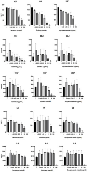 BM-SCs were cultured in three different ways: (1) unstimulated, (2) stimulated with IFN-γ and TNF-α, or (3) stimulated with cytokines in the presence of different concentrations of IS drugs. The production of cytokines HGF, VEGF, CCL2, IL-8, and IL-6 was determined by ELISA after 48h of cultivation. As shown in Figure 4, IS drugs significantly decreased the production of all of these cytokines and growth factors. The production of HGF was significantly inhibited in the presence of sirolimus, mycophenolate mofetil, and tacrolimus in concentrations of 5 µg/mL and higher. Tacrolimus proved to be the most potent inhibitor of CCL2, IL-8, and IL-6 production. Sirolimus brought about the most pronounced decrease in VEGF production (Figure 4).