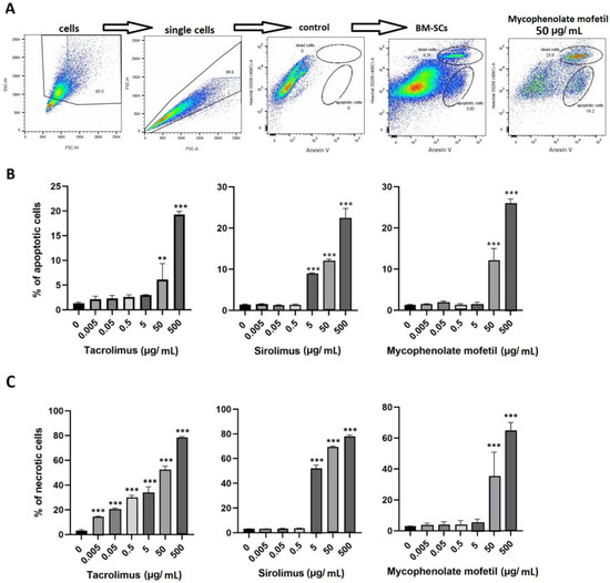 The effect of IS drugs on apoptosis (B) and cell death (C) of BM-SCs. The cells were cultured for 48 h untreated (0) or in the presence of different concentrations of tacrolimus, sirolimus, or mycophenolate mofetil, and the percentages of apoptotic and dead cells were measured by flow cytometry. Representative dot plots show the common gating strategy of labeling single-cell suspension, control (Anexin V− Hoechst3358−), and both groups of cultured BM-SCs: untreated and exposed to mycophenolate mofetil (50 µg/mL) (A). Each bar represents the mean + SD measured in triplicate from 6 patients. Values with asterisks are significantly different from control “0” (** p < 0.01; *** p < 0.001).