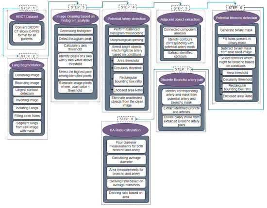 This research aims to segment the BA pairs using HRCT images of the lungs. The BA pairs are detected and segmented using different image preprocessing algorithms. The major steps are image cleaning, potential artery detection, potential bronchus detection, BA pair identification and BA ratio measurement. Figure 3 illustrates the methodology used to extract BA pairs.