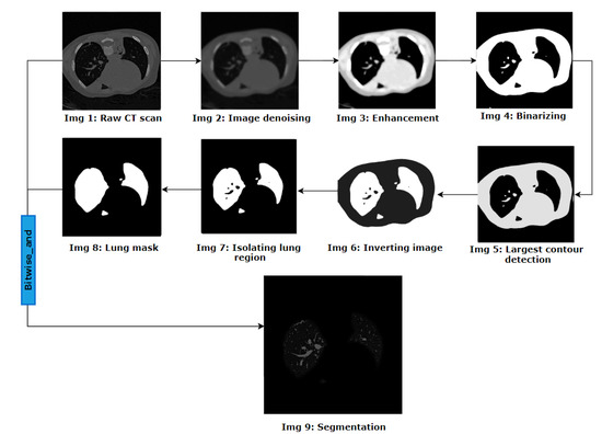 This automated approach applies a suite of algorithms to all the 2D axial slices of the CT scans. The noise of the original images is removed using the total variation denoising technique, which preserves the edge information (Img 2 of Figure 4). To define the lung regions better, the conditional alpha beta correction method is applied to dynamically adjust the overall brightness and contrast of the denoised image based on the mean pixel value for each image. The images are then converted to binary format using the Otsu thresholding algorithm. In this way, the pixel value of most of the lung regions becomes 0. However, some remaining artifacts in the images can be eliminated by means of the largest contour detection technique. The resultant image is inverted, meaning the lung areas become white, surrounded by black regions. Employing the flood fill algorithm to the inverted image, the pixel value of the regions outside the lungs is turned to 0. Objects such as bronchi, arteries and veins are still visible inside the lungs. To acquire a binary mask containing only the lung regions, these are eliminated using the morphological reconstruction method. The binary mask thus obtained is then merged with the original image to segment the lung regions.