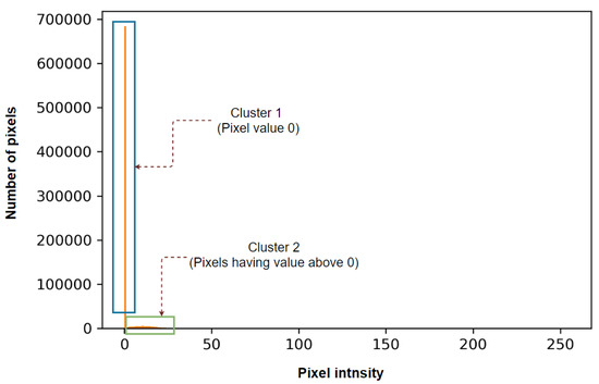 For better understanding, the histogram plot of Figure 5 is split into two clusters. Cluster 1 contains only the pixels with an intensity of 0, and Cluster 2 includes all others. As the pixel value 0 (cluster 1) is the most common, different intensity levels (cluster 2) can barely be seen in the plot. This is caused by the fact that in the segmented lung images, the background (pixel value 0) covers most of the image area. For a better visualization of cluster 2, all the 0 values are removed, and the histogram plot is generated again. Figure 6 shows the histogram after removing all the pixel values of 0.