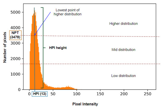It can be observed from Figure 6 that after discarding the pixel values of 0, pixels of other intensity levels are visible. This approach aims to discard as many unwanted pixels as possible without affecting the BA region. To achieve this, two threshold values are derived from the histogram: the number of pixel thresholds (NPT) and the pixel intensity threshold (PIT). The PIT is based on the value of the NPT. To determine NPT, the highest peak intensity (HPI) of the histogram distribution is considered. Utilizing the HPI height, the histogram plot is horizontally divided into three distributions, a high distribution, a middle distribution, and a low distribution. The value of the NPT is the lower limit of the increased distribution of the histogram. For this particular CT scan histogram (Figure 6), the HPI value is 13. After dividing the histogram into three distributions, the lower limit of the high distribution, the NPT, is found to be 3478. If we observe the original image (Img 8 of Figure 4), it can be seen that there is a large number of tiny noises with comparatively low pixel intensities values. The method of deriving the PIT using NPT is visualized in Figure 7.