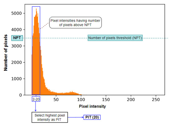 As can be seen in Figure 7, the NPT determines the PIT. The pixel intensities with several pixels larger or equal to the NPT are within the blue box. The highest intensity within this range is the PIT. For the CT scan histogram example of Figure 7, it can be seen that the pixels in the blue box have intensity levels in the range of 2 to 20. The highest intensity, 20, is selected as the threshold for this particular CT scan, and all the pixels with intensities below 20 are removed. The histogram could be divided into more distribution levels (Figure 6), resulting in different threshold values. After experimentation with different numbers, it was found that dividing the histogram into three distributions resulted in the best output. The pseudo-code of Algorithm 1 describes all the steps of the histogram-based cleaning process.