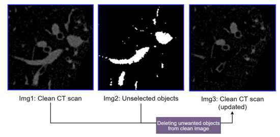 The output of this process (Img 2 of Figure 10) depicts the selected bright objects considered potential arteries. Furthermore, Img 3 is another output of this process where a mask is generated containing all the discarded bright objects. As these objects do not meet the criteria of Equation (4), these objects are removed from the previously obtained clean CT scan (Img 2 of Figure 8), and the resultant image is considered the updated, clean CT scan (Img 3 of Figure 11).