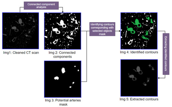In this process, the objects accompanying potential arteries are extracted employing connected component analysis and coordinate matching methods. The connected component analysis technique is applied to the updated, clean image (Img 3 of Figure 11). This results in a binary image containing all the connected components. The coordinates of the potential arteries (Img 3 of Figure 10) are matched with the connected component resultant binary image to extract the contours of the accompanying objects. If a binary mask contour matches the coordinates of a potential artery, it is identified as a potential BA pair, whereas objects not adjacent to arteries remain unidentified. The identified contours are marked in green in Figure 12. These identified contours are extracted from the updated, clean CT image. Figure 12 illustrates this process and shows the step-by-step output.