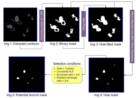 Bronchiectasis is a serious lung condition caused by bacterial inflammation and can result in a low life expectancy. It can be described by irreparable bronchial dilatation [1]. Bronchiectasis is common in indigenous children in Australia, with signs early in life [2]. Bronchiectasis in children and adults has similarities but also considerable differences. In cystic fibrosis (CF) infants, bronchiectasis has been detected at ten weeks of age [3,4]. In 3–5 years old patients with CF, 50–70% are affected by bronchiectasis [5]. Bronchiectasis, unrelated to CF, is also increasing in children and adults [6]. To prevent further progression of bronchiectasis, early detection is crucial [7,8,9]. At present, the gold standard in diagnosing bronchiectasis is high-resolution computed tomography (HRCT), where an increased broncho-arterial (BA) ratio is regarded as one of the key markers [10,11]. However, the BA ratio of children and adults may differ as lung morphology and structure alter with age [9]. The exact BA ratio, which indicates bronchiectasis is a topic of debate. The BA ratio can be measured from CT scans by expert radiologists using electronic calipers [9]. Naseri et al. [12] employed image preprocessing, threshold-based and model-based techniques to distinguish airways and lung vessels using HRCT images. Prasad et al. [13] applied multi-view and active learning approaches in detecting bronchial dilatation using lung HRCT images. Gao et al. [14] segmented bronchi, arteries and pulmonary veins from CT images using Amira 4.1 software (Thermo Fisher Scientific; Waltham, MA, USA) and marked each component differently. To detect valid and invalid airway walls, Schmidt et al. [15] introduced image preprocessing methods for CT scans based on local intensity levels. For the segmentation of airway trees, Meng et al. [16] applied image preprocessing and a support vector machine algorithm on lung CT scan images. Prasad and Sowmya [17] extracted the lung regions from CT scans, applying image preprocessing methods. A region-growing algorithm was applied to detect bronchi and the broncho-vascular pairs through co-training and an active learning approach. Perez et al. [18] conducted lung segmentation from a CT scan using a Hessian eigenvalue analysis algorithm. Airways and vessels were extracted using image preprocessing methods. Zrimec and Busayarat [19] detected bronchi and arteries employing the local intensity gradient method, a region-growing algorithm with leaking correction and a rule-based classification approach using CT scan images. Busayarat and Zrimec [20] detected bronchi and arteries using image preprocessing algorithms to evaluate bronchial dilatation. Though the bronchial dilatation cutoff is defined as a BA ratio larger than 1 [21], this ratio is smaller in younger people. Several bronchiectasis studies have reported a lower BA ratio in young adults than in older ones [22]. Park et al. [23] observed an average BA ratio 0.65 while studying healthy subjects. A BA ratio of 0.62 ± 0.02 was reported by Berend et al. [24] for the normal lungs of four subjects. Matsuoka et al. [22] found that for the age group of 20–40, the mean BA ratio is 0.609 ± 0.05, whereas, for patients over 65, the mean BA ratio is 0.782 ± 0.08. Kapur et al. [9] found BA ratios in the range of 0.437–0.739 for children. Therefore, determining the BA ratio in children has become a key research interest. However, detecting BA pairs manually is time-consuming and often tedious and error-prone [18]. An automated system to detect BA pairs from HRCT scans might be a suitable approach [12,13]. This research, therefore, aims to detect BA pairs from CT scan images to diagnose bronchiectasis in children through an automated approach.