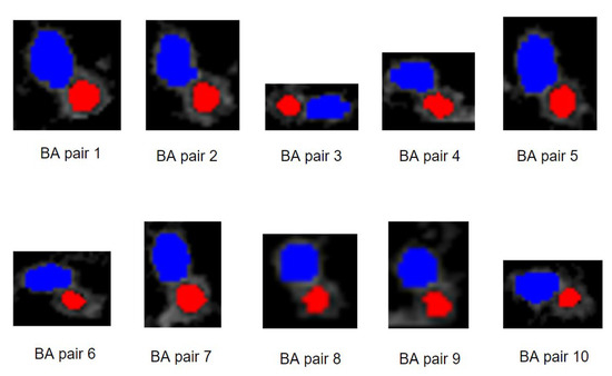 Figure 15 depicts BA pairs. Bronchi are marked with a red color, and arteries are marked with a blue color. The locations of these BA pairs are presented in Table 3.