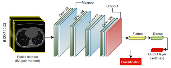 After the BA pairs are highlighted, the dataset is split into a training, validation, and test set with a ratio of 70:10:20. The classification is carried out using a shallow convolutional neural network (CNN) model (Figure 19). The model has four convolutional layers, each followed by one maxpool layer. The activation function for the convolutional layers is rectified linear unit (ReLU). The kernel sizes for the convolutional and maxpool layers are 3 × 3 and 2 × 2, respectively. The kernels from the first to the fourth convolutional layers are 32, 64, 64 and 128, respectively. After the last maxpool layer, a dropout layer is added with a dropout factor 0.2. Finally, a fully connected layer is added, and the classification is carried out using the SoftMax activation function and the categorical cross-entropy loss function. The model is trained for 200 epochs, with optimizer Adam, a learning rate of 0.001 and a batch size of 32.