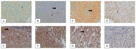 Immunohistochemical expression of YAP, TAZ, TEAD4 and LATS1 in the epithelial component of TETs. YAP in two A-type thymomas [(A) nuclear (H-score: 140), (B) nuclear (H-score: 25) and cytoplasmic (H-score: 80)]. TAZ in a type B3 thymoma [(C) cytoplasmic (H-score: 300)] and in a thymic carcinoma [(D) nuclear (H-score: 180)]. TEAD4 in a thymic carcinoma [(E) nuclear (H-score: 160) and cytoplasmic (H-score: 160)] and in a type B3 thymoma [(F) nuclear (H-score: 270) and cytoplasmic (H-score: 200)]. LATS1 in a type B3 thymoma (G) [nuclear (H-score: 180) and cytoplasmic (H-score: 90)] and in a type B2 thymoma [(H) nuclear (H-score: 120)]. All pictures are at ×400 magnification. All thin arrows show indicative areas of nuclear staining and thick arrows show areas of cytoplasmic staining.