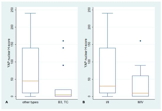 Association between nuclear YAP H-score and (A) WHO type or (B) Masaoka–Koga stage. The red line denotes median value. Lower nuclear H-score was observed in epithelial-rich TETs (B3, TC) compared to the other TETs (p = 0.0042) (A). Moreover, advanced Masaoka–Koga stages (III/IV) were associated with a lower nuclear H-score (p = 0.042) (B).