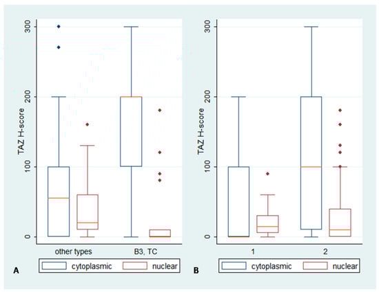 Association between cytoplasmic and nuclear TAZ H-score and (A) WHO type or (B) Masaoka–Koga stage. The red line denotes median value. Higher cytoplasmic and lower nuclear H-score was observed in epithelial-rich TETs (B3, TC) compared to the other types (p = 0.0001 for cytoplasmic and p = 0.0215 for nuclear) (A). Advanced Masaoka–Koga stages (III/IV) were associated with higher cytoplasmic H-score (p = 0.0308) (B).