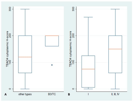 Association between TEAD4 cytoplasmic H-score and (A) WHO type or (B) Masaoka–Koga stage. The red line denotes median value. Higher cytoplasmic H-score was observed in epithelial-rich TETs (B3, TC) compared to the other TET types (p = 0.002) (A). Moreover, advanced Masaoka–Koga stages (II/III/IV) were associated with a marginally higher cytoplasmic H-score (p = 0.05) (B).