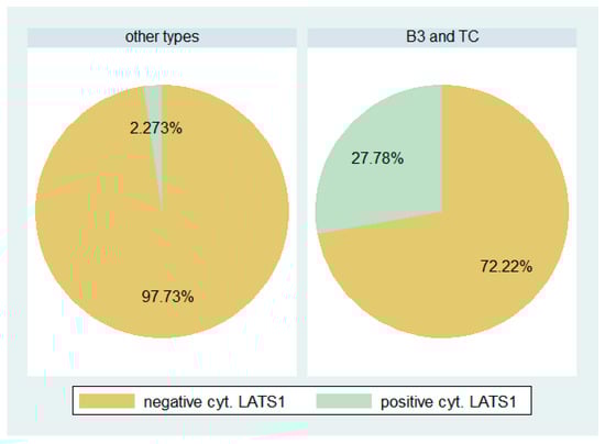 Positive immunoreactivity for LATS1 was observed in 77.4% of the cases (Figure 1, Table 2). All the positive cases showcased nuclear immunoreactivity, 6 of them also showed a cytoplasmic staining. LATS1 nuclear and cytoplasmic H-scores were positively associated (Spearman’s correlation coefficient R = 0.3332, p = 0.0271). The epithelial-rich TETs (B3, TC) more often displayed a cytoplasmic LATS1 immunoexpression (Fischer’s exact test, p = 0.006, 27.7% versus 2.3%, Figure 5). The same applied to the more advanced stage tumors (III/IV), which were more often LATS1 cytoplasmic positive (Fischer’s exact test, p = 0.04, 25% versus 4%). In addition, a negative correlation was observed between the LATS1 cytoplasmic H-score and the TAZ nuclear H-score (Spearman’s correlation coefficient R = −0.3464 p = 0.0213). No significant association was identified between the LATS1 H-score and the remaining clinicopathological parameters, including patients’ OS or DFS (p < 0.10).