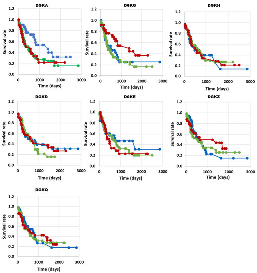 DGK expression and survival correlation in AML (TGCA database). The high, low and normal DGK groups are shown in red, blue and green, respectively. DGKA n (up) = 26, n (no change) = 50, n (down) = 30, with p = 0.04 *; DGKG n (up) = 30, n (no change) = 48, n (down) = 27, with p = 0.03 *; DGKH n (up) = 25, n (no change) = 50, n (down) = 29, with p = 0.99; DGKD n (up) = 28, n (no change) = 47, n (down) = 31, with p = 0.76; DGKE n (up) = 28, n (no change) = 53, n (down) = 26, with p = 0.51; DGKZ n (up) = 23, n (no change) = 45, n (down) = 31, with p = 0.55; DGKQ n (up) = 28, n (no change) = 47, n (down) = 29, with p = 0.92; * p < 0.05.