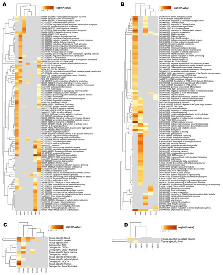 Analysis of DGK co-expressed genes in the BeatAML database. (A) Heatmap representing the hierarchical clustering of the top enriched pathways obtained by Metascape, using as input the set of genes positively correlated (q-value < 0.05; Spearman’s correlation > 0.40) with the DGK isoforms (columns), according to cBioPortal data. Each row represents a functional cluster. (B) Heatmap representing the hierarchical clustering of the top enriched pathways obtained by Metascape, using as input the set of genes negatively correlated (q-value < 0.05; Spearman’s correlation < −0.40) with the DGK isoforms (columns), according to cBioPortal data. Each row represents a functional cluster. (C) Heatmap of PaGenBase enrichment for genes co-expressed with DGK isoforms from Metascape, obtained giving as input the genes positively correlated with the DGK isoforms (q-value < 0.05; Spearman’s correlation > 0.40). Each row represents tissues and cell types. (D) Heatmap of PaGenBase enrichment for genes co-expressed with DGKs from Metascape, obtained by giving as input the genes negatively correlated with the DGK isoforms (q-value < 0.05; Spearman’s correlation < −0.40). Each row represents tissues and cell types.