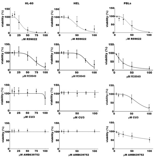 As our data suggested an alteration of diacylglycerol signaling in AML and an isoform-specific contribution of DGK to cell transformation, we sought to determine the potential of DGK inhibitors as therapeutic targets in AML. For this purpose, we evaluated their cytotoxic effects on the AML cell lines HL-60 (promyelocytic leukemia) and HEL (erythroleukemia). In parallel, we used activated PBLs from healthy donors as references, as they express high levels of DGKs that are known to play a role in proliferation and survival [32]. Interestingly, HL-60 and HEL cell lines exhibited low DGKA and high DGKZ expression levels compared to PBLs. The DGKG content was lower in HEL but higher in HL-60 (Supplementary Figure S7). We tested various DGK inhibitors, including commercially available inhibitors targeting DGKA and other isoforms as well as serotonin receptors (R59022 and R59959) [33], a DGKA-specific ATP competitive inhibitor (CU-3) [34], and an in-house-developed DGKA-specific inhibitor that does not affect serotonin receptors (AMB639752) [22,23]. All tested molecules showed activity at a concentration of 400 μM against purified DGKA in an in vitro kinase assay (Supplementary Figure S1).