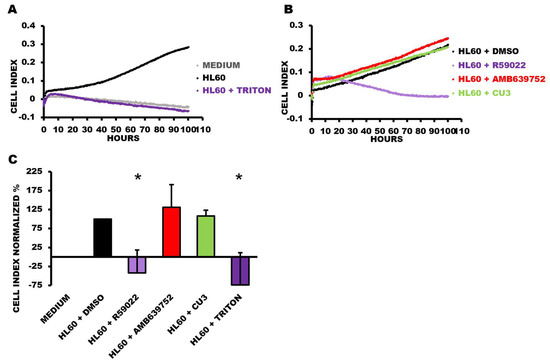 Viability time course of HL-60 cells treated with DGKA inhibitors. HL-60 cells were plated in the presence or absence of the indicated treatments at a concentration of 50 µM and followed for 100 h. Data are presented as an impedance trend over time. Representative experiment showing (A) control conditions and (B) the treated samples. (C) The graph represents the mean of four independent experiments at 91 h. The data were normalized to the respective control (HL60 + DMSO) and shown as the mean ± SD of the percentage. * p < 0.05, t-test vs. HL60 + DMSO.