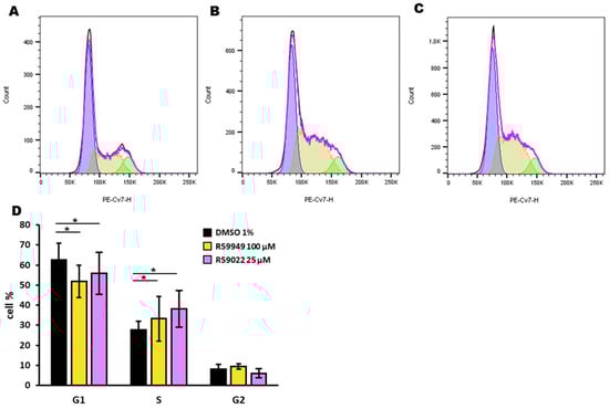 Effect of DGK inhibitors on the HL-60 cell cycle. HL-60 cells were treated with DMSO (1%), R59022 (25 µM), or R59949 (100 µM) and incubated for 24 h before DraQ5 staining. Black line: experimentally observed data; purple line: data estimated by the analysis model; blue: estimated G1 phase; yellow: estimated S phase; green: estimated G2 phase. Representative experiment indicating cells treated with (A) DMSO, (B) R59022, or (C) R5949. (D) Percentage of cells in each phase of the cell cycle for each treatment. Data are expressed as the mean ± SD of five independent experiments. * t-test, p < 0.05.