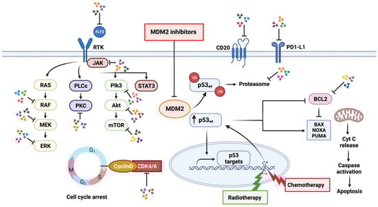 Potential synergistic interactions between different therapeutic modalities and MDM2 inhibitors. Chemotherapy and radiation therapy (RT) remain the most promising and thoroughly researched combination partners for MDM2 inhibition. MDM2 and p53 activities are closely associated with the efficacy of chemotherapeutic drugs that work by damaging DNA, and inhibition of MDM2 renders tumor cells more susceptible to these types of pharmacotherapies. MDM2 inhibitors increase the effectiveness of RT by radiosensitizing tumor cells. Additionally, potential synergistic pathway inhibition with small-molecule-targeted therapies and other treatment modalities, such as immunotherapy, is conceivable and the subject of ongoing research (colored arrowheads signify examples of targeted molecules). Created with BioRender.com (accessed on 15 February 2023).