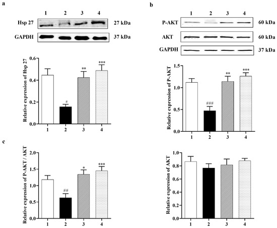 Effect of Carbamathione on the expression of Hsp 27, P-AKT, and AKT after glutamate (10 mM) treatment. Western blot analysis using antibodies against Hsp 27 (a) and P-AKT, AKT (b). The bar graphs reflect the densitometry data from the respective experiments for Hsp 27 (n = 6) (a), P-AKT, AKT (b), and P-AKT/AKT (c) (F (3, 14) = 9.226; p = 0.0013 (n = 5)) Western blot. Note: 1—control, 2—glutamate (10 mM for 24 h), 3—Carbamathione (25 µM for 1 h) followed by glutamate (10 mM for 24 h), and 4—Carbamathione (25 µM for 24 h) with glutamate (10 mM for 24 h). (All data are presented as mean ± SEM, where #/* p < 0.05, ##/** p < 0.01, ###/*** p < 0.001. Pound signs (#) indicate statistical significance between groups 1 and 2; asterisks (*) indicate statistical significance between groups 2 and 3 and between groups 2 and 4).