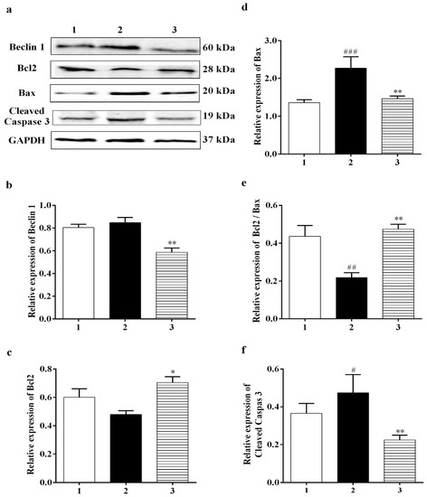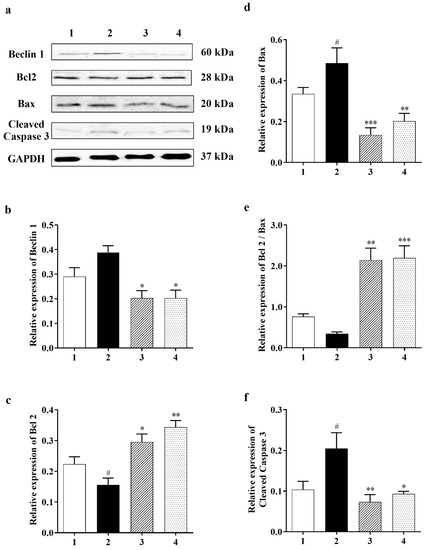 Effect of Carbamathione on the glutamate-induced elevated expression of Beclin 1, Bax, and cleaved caspase-3 and the glutamate-induced decreased expression of Bcl2. (a) Western blot analysis using antibodies against Beclin 1, Bcl2, Bax, and cleaved caspase-3. The bar graphs reflected the densitometry data from the respective experiments for Beclin 1 ((b) (n = 6)), Bcl2 (c), Bax (d), Bcl2/Bax (e), and cleaved caspase-3 (f) (n = 5) Western blot. Note: 1—control, 2—glutamate (10 mM for 24 h), 3—Carbamathione (25 µM for 1 h) followed by glutamate (10 mM for 24 h), and 4—Carbamathione (25 µM for 24 h) with glutamate (10 mM for 24 h). (All data are presented as mean ± SEM, where #/* p < 0.05, ** p < 0.01, and *** p < 0.001. Pound signs (#) indicate statistical significance between groups 1 and 2; asterisks (*) indicate statistical significance between groups 2 and 3 and between groups 2 and 4).