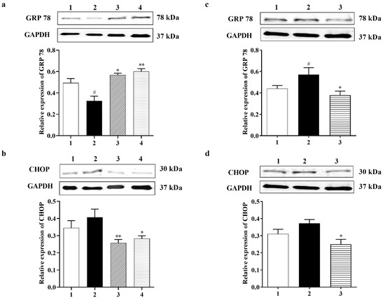 Effect of Carbamathione on ER stress induced by glutamate and hypoxia/reoxygenation. Western blot analysis using antibodies against GRP 78 (a,c) and CHOP (b,d).The bar graphs reflect the densitometry data from the respective experiments for GRP 78 (a) and CHOP (b) Western blot in the glutamate-treated PC-12 cells. Note: 1—control, 2—glutamate (10 mM for 24 h), 3-carbamathione (25 µM for 1 h) followed by glutamate (10 mM for 24 h), and 4—Carbamathione (25 µM for 24 h) with glutamate (10 mM for 24 h). (All data are presented as mean ± SEM (n = 5), where #/* p < 0.05, ** p < 0.01. Pound signs (#) indicate statistical significance between groups 1 and 2; asterisks (*) indicate statistical significance between groups 2 and 3 and between 2 and 4). The bar graphs reflect the densitometry data from the experiment for GRP 78 ((c) (n = 7)) and CHOP ((d) (n = 5)) Western blot in the hypoxia/reoxygenation-treated PC-12 cells. Hypoxia (2) = hypoxia (0.3% O2) for 24 h, reoxygenation for 24 h; Carb + hypoxia: cells were treated with 25 µM Carbamathione for 1 h, then hypoxia for 24 h, and reoxygenation for 24 h. Note: 1—control (Normoxia 48 h); 2—hypoxia/reoxygenation (48 h); and 3—hypoxia/reoxygenation (48 h) after 1 h, 25 µM Carbamathione preincubation. (All data are presented as mean ± SEM; #/* p < 0.05,** p < 0.01. Pound signs (#) indicate statistical significance between groups 1 and 2; asterisks (*) indicate statistical significance between groups 2 and 3).