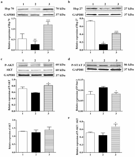 Mammalian cells can react to a range of stresses such as heat, cold, oxidative stress, metabolic disturbance, and environmental toxins through necrotic or apoptotic cell death, while increased expression and phosphorylation of heat shock proteins such as Hsp 27 can guard cells against cellular stress. Heat shock proteins (Hsp) generally display molecular chaperone activity and act together with a broad range of proteins to exhibit specific effects. Previously, Settler et al. [41] showed that Hsp 27 overexpression confers long-term neuroprotection against cerebral ischemia. Increases in the levels of Hsp 70 by 4.25-fold and Hsp 27 by 3-fold were found in the Carb-treated group relative to the hypoxia–reoxygenation group alone (Figure 5a (F (2, 14) = 6.364; p = 0.05 (n = 5)) and 5b (F (2, 8) = 189.6; p < 0.01 (n = 5)). In this experiment, P-AKT (the activated form of AKT) showed up-regulation by 1.5-fold in the Carb-treated groups relative to the hypoxia–reoxygenation-treated groups (Figure 5c (F (2, 9) = 4.974; p < 0.05 (n = 5)), whereas AKT expression showed no significant changes when Carb was used (Figure 5c (F (2, 10) = 0.3336; p = 0.7240 (n = 5)). The expression of P-STAT 3 was determined using a Western blot (Figure 5d (F (2, 12) = 4.867; p < 0.05 (n = 5)). Carb significantly decreased P-STAT 3 to <70% in the Carb-treated groups relative to the hypoxia/reoxygenation-treated groups.