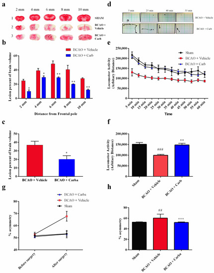 where Vc is the volume of both hemispheres (compare the value with the whole brain of sham) and VL is the volume of non-lesioned tissue in the lesioned hemisphere [34,35]. Then, these sections were analyzed in the different treated and untreated animal groups.