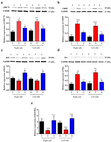 A 12% sodium dodecyl sulfate–polyacrylamide gel electrophoresis was used to separate protein samples, which were transferred onto nitrocellulose membranes. A Western blot was conducted as described before [37] with the following primary antibodies overnight: Abcam (Waltham, MA 02453, USA): GRP 78, Hsp 70, Hsp 27, activating transcription factor 4 (ATF4), Caspase- 12, IRE1 and X-box-binding protein 1 (XBP-1) (1:500); Cell Signaling(Danvers, MA 01923, USA): GAPDH (1:3000), Beclin 1, eukaryotic translation initiation factor 2 α (eIF2α), P-eIF2α, P-STAT 3, Bax, AKT, phosphorylated AKT (p-AKT) and Cleaved Caspase-3 (1:500); Santa Cruz: CHOP/GADD153) and Bcl2 (1:500); Novus Biologicals (Centennial, CO 80112, USA): ATF6 (1:1500) (Supplementary Table S2). The membranes were washed three times with Tris-buffered saline containing 0.1% Tween-20 (TBS-T) and incubated with secondary antibodies for 1 h at room temperature. The secondary antibodies utilized were goat IRDye 800-conjugated anti-rabbit (1:15,000) and IRDye 680 conjugated anti-mouse (1: 15,000) antibodies (LI-COR Biosciences, Lincoln, NE, USA). Fluorescent signals were identified with an LI-COR Odyssey Fc system, and the images were analyzed with either Image Studio 2.0 software or Image J software 1.52j [36].