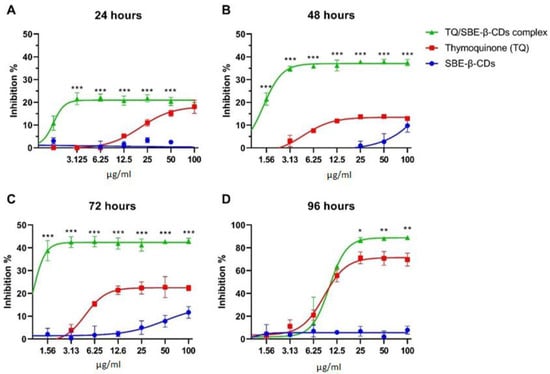 (A–D) Cytotoxicity results of leukaemia cells (K-562) after 24, 48, 72, and 96 h of the treatment. The control group was untreated cells. Data are presented as mean ± SD. * p < 0.05, ** p < 0.01, *** p < 0.001 indicate significant differences between TQ and TQ/SBE-ß-CDs for the same concentration level.
