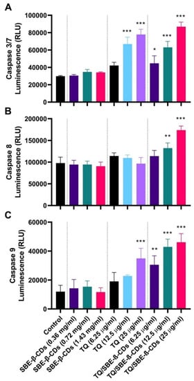 The activity of Caspase-Glo® 3/7, 8, and 9 enzymes was assessed in a 96-well plate using Caspase-Glo® 3/7 Assay, Caspase-Glo® 8 Assay, and Caspase-Glo® 9 Assay kits (Promega, Madison, WI, USA, Cat. G8091, Cat. G8201, and Cat. G8211, respectively), as per the guidelines provided by the manufacturer. Briefly, after a 96-hour incubation period of the K-562 cells with SBE-β-CDs (at concentrations of 0.36, 0.72, and 1.43 mg/mL); TQ (at concentrations of 6.25, 12.5, and 25 µg/mL); or a TQ /SBE-β-CDs complex (at concentrations of 6.25, 12.5, and 25 µg/mL), an analysis was carried out. The negative control comprised cells treated with vehicle in a medium. Each type of caspase was examined in a separate set of wells. For each well on a white-walled plate that contained 100 µL of either negative control cells or treated cells in a culture medium, 100 µL of Caspase-Glo Reagent was added. Subsequently, the contents of the wells were mixed gently using a plate shaker at a speed of 300–500 rpm for half a minute, followed by an incubation period of an hour at room temperature. The luminescence for each sample was then measured using a plate-reading luminometer.