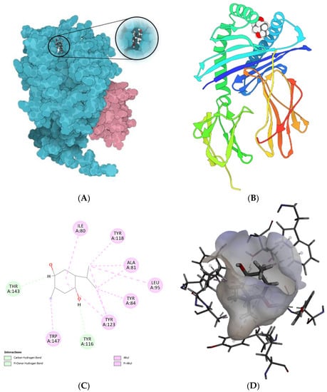 Molecular docking modeling of thymoquinone with telomerase. (A) telomerase; (B) telomerase; (C) Thymoquinone; (D) the geometric interaction of thymoquinone with telomerase.