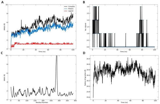 Molecular dynamic simulation results. (A) Root mean square deviation (RMSD) values for α-carbon atoms (blue curves) of telomerase and TQ (red curves); (B) H-bond number formed over the simulation time; (C) root mean square fluctuation (RMSF) results; (D) radius of gyration, plotted with respect to 100 ns MD simulation time.