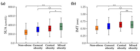 Serum urate (SU) and intima-media thickness (IMT) across the studied groups. Comparison of SU levels (a) and IMT values (b) between the non-obese and subjects with general, central and mixed obesity; * p < 0.05, ** p < 0.001, ns—non-significant.