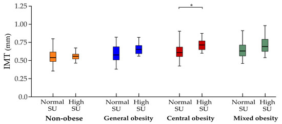 Estimates of intima-media thickness (IMT) across subject subgroups. Comparison of IMT values between subjects with normal and high serum urate (SU) levels among the non-obese and general, central and mixed obesity groups; * p < 0.05.