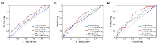 Receiver operating characteristic (ROC) curve analysis. Area under the ROC curve (AUC) assessing the performance of serum urate in detection of subjects with increased IMT (a), subjects with carotid plaques (b) and subjects with vulnerable carotid plaques (types 1 and 2) (c) in each obesity group. In the legend, AUCs with 95% confidence intervals are shown for each obesity group.