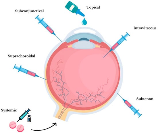 The routes of TA administration have become one of the main challenges in ocular pharmacology. The ocular globe is separated anatomically into two separate segments, the anterior and posterior. The anterior segment includes the cornea, iris, ciliary bodies, and lens and includes all the spaces filled with the aqueous humor. The posterior segment extends behind the lens and includes the retina, choroid, and optic nerve, and the vitreous cavity filled with the vitreous gel [24]. The difference between the anterior and posterior segments of the eye has forced the development of topical, intravitreal, and periocular (suprachoroidal, subtenon, and subconjunctival) injections, and systemic (parenteral, oral) TA formulations to achieve greater efficacy and minimize adverse effects in the treatment of their respective segmental diseases. A summary of the different routes of TA ocular drug delivery is depicted in Figure 1.