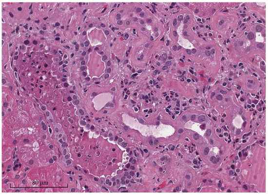 The classic pathology of allograft pyelonephritis is characterized by neutrophilic tubulitis and interstitial inflammation [26]. This includes the presence of polymorphonuclear cells (PMNs) in the renal interstitium and tubular basement membrane (Figure 1). PMNs can also accumulate in the renal tubular lumens, causing a PMN cast, infiltrating the peritubular capillary areas, and forming microabscesses. It should be noted that PMNs can also be presented in the interstitium or tubular lumens in other conditions besides pyelonephritis, such as acute rejection, acute glomerulonephritis, or acute tubular necrosis. However, these conditions usually have only a few PMNs compared to the large numbers of PMNs that are present in acute allograft pyelonephritis. Moreover, the inflammatory areas in allograft pyelonephritis are patchy or zonal, compared with more diffuse cellular infiltrations found in acute T cell-mediated rejection (TCMR) [27,28].